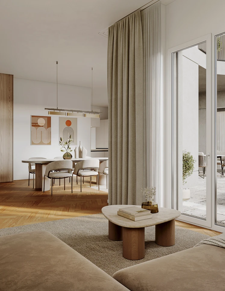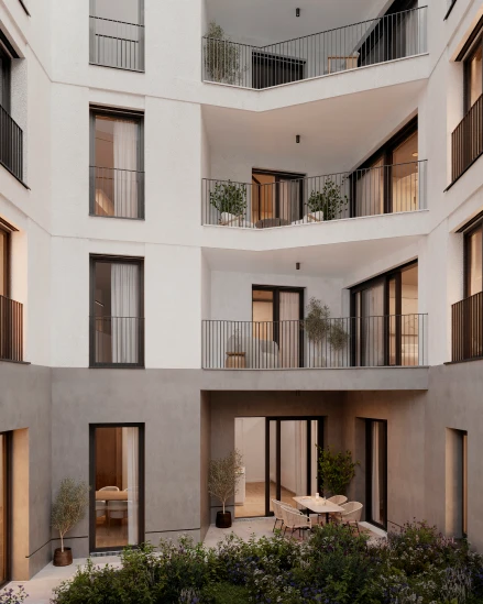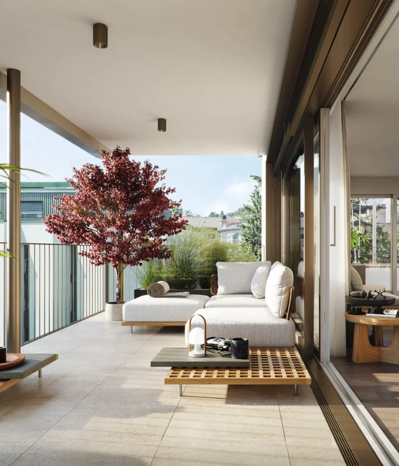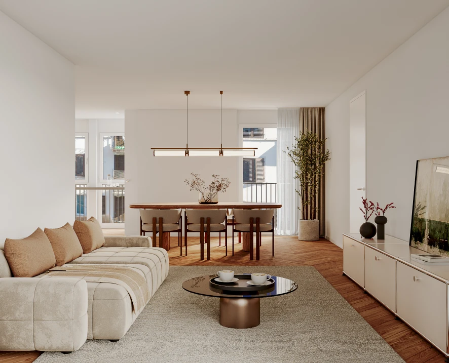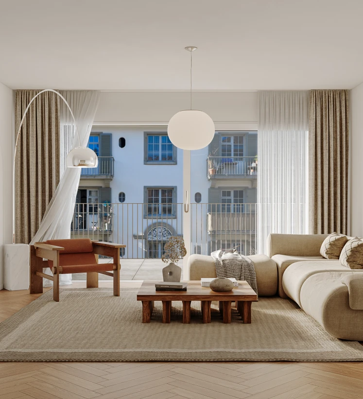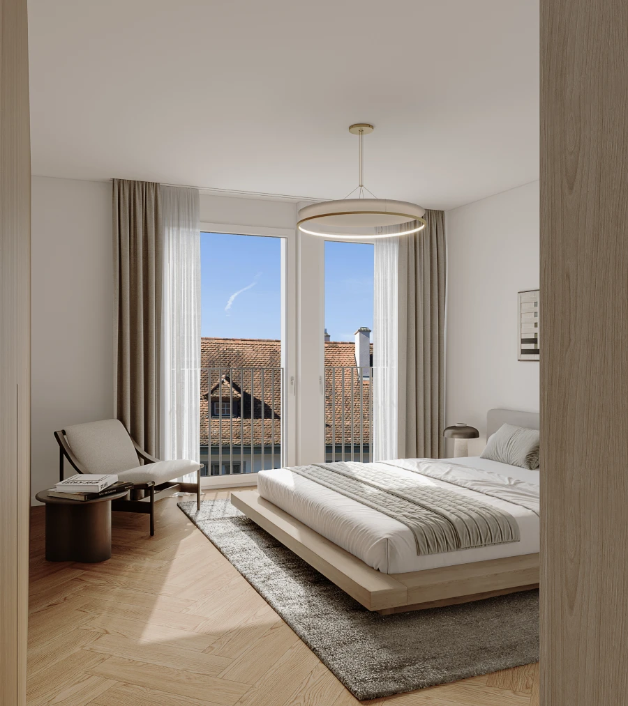 Obergeschoss und schaffen bewusst einen Gegenpol zur Stadt: klare Räume, ruhige Materialien und eine Atmosphäre, die Rückzug ermöglicht, ohne sich abzuschotten. Grosszügige Balkone und Terrassen erweitern den Wohnraum nach aussen, als private Perspektive über die Stadt hinweg. Mit Wohnflächen von rund 83 bis 132 m2 entstehen Lebensräume, die beides vereinen: das Leben mitten im Geschehen und die Möglichkeit, sich jederzeit zurückzuziehen.